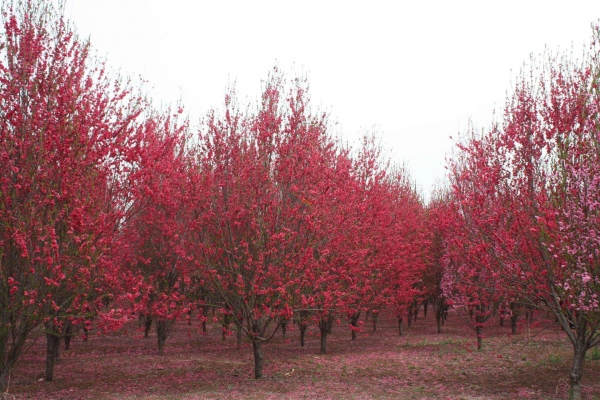龙柱碧桃是乔木,株高8-16米,生成迅速,3年可长达4-6米,树形紧凑,呈圆柱状,直立挺拔,魅力独特,4月份开花,花枝繁密,花多艳丽,花期长40天,比普通碧桃花期长10天。龙柱碧桃花后结果,可食用,三季叶片鲜红,到冬天枝条转红。