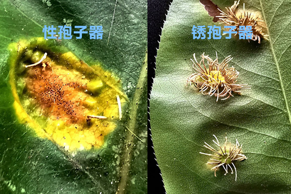 梨锈病又称赤星病、羊胡子,是由梨胶锈菌侵染所引起的、发生在梨上的病害。主要危害叶片和新梢,严重时也危害幼果,也危害叶柄和果柄。侵染叶片后, 在叶片正面表现为橙色,近圆形病斑,病斑略凹陷,斑上密生黄色针头状小点,叶背面病斑略突起,后期长出黄褐色毛状物。果实和果柄上的症状与叶背症状相似,幼果发病能造成果实畸形和早落。