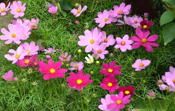 波斯菊,性强健,花开夏秋,但主要在秋季开花,花期较长,陕西宝鸡地域8月至11月均为盛花期(四月底播种),一般可在春季播种,在昆明6月播种,照常出苗。波斯菊种子较大,每平方米播种10克之20克即可。它不择土壤,滇池边的沼泽泥炭地和渭河边的河滩沙石地均能生长,需要的肥水较少,有一定的耐涝能力,管护强度低。由于波斯菊植株较高,如欲降低植株高度,可在花前,对植株进行摘心,抹顶,压低植株高度,促进植株萌发侧枝花叶。