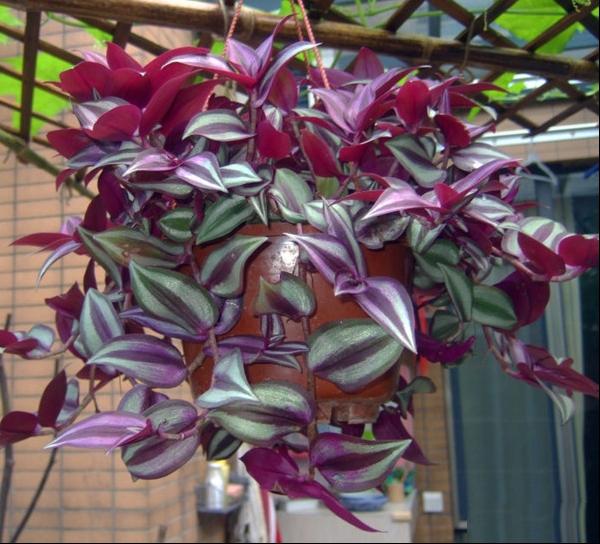 3、吊竹梅要求较高的空气湿度,若空气干燥,叶片常易干,叶尖焦枯。因此,生长季节应注意经常向茎叶上喷水,以保持空气湿度。