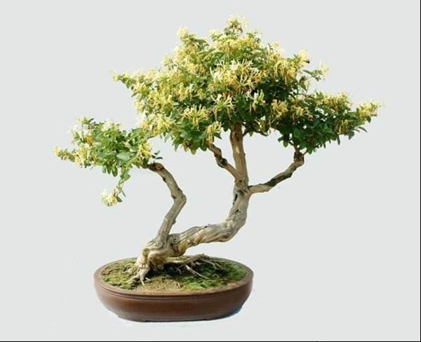 金银花为忍冬科植物,多年生半常绿缠绕灌木。每年花期5至10月,初开时白色,3天后变为金黄色,芳香。我国大部分地区平原沃地、山区丘陵、路旁堤坝等地均有自然分布。金银花除地栽外,还是不可多得的观花、观干盆景好材料。因其枝干较大,虽然干形苍劲古朴,但枝干极脆,易折断、腐烂,较大的枝干,不要轻易去改变其形状和角度,更不能象制作其它杂木盆景那样,去扭曲主干、主枝的形状角度。
