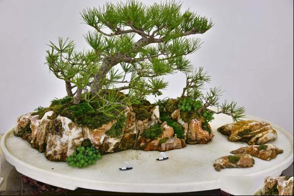 “石本顽,树活则灵”。山水盆景中的花木有增加气势、协调重心、分隔层次的作用,可加强山水盆景的真实感和美感。