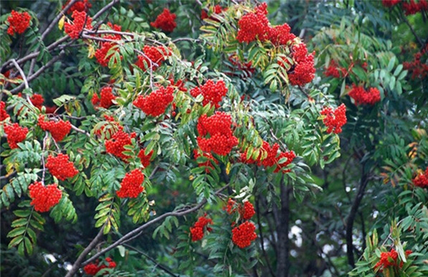 百华花楸 学名[Sorbuspohuashanensis(Hante)Hedl.属蔷薇科,花楸属,落叶小乔木,高达8m,别名百华山花楸、花楸、马家木。奇数羽状复叶,小叶11~15枚,椭圆状距圆形,长2.5~8cm,先端尖或渐尖,顶生小叶基部楔形,两侧小叶多一边楔形一边近圆形,小叶上部有锯齿,下部全缘叶下面灰绿色,沿叶脉有白柔毛,托叶有时宿存,半圆形,缘有齿牙状锯齿,花序总轴上常有白色柔毛,果球形,径约6~8mm,萼裂片闭合宿存,熟时朱红色,花期6月,果熟期9~10月。