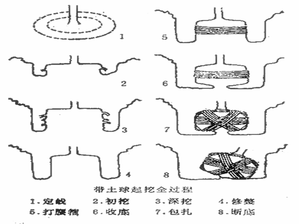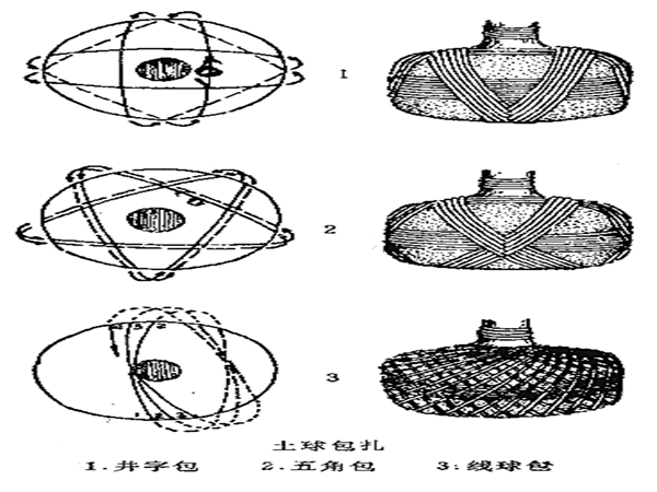 打腰箍完毕后即行收底。用利锹从四面向土球底部收挖,直至心部只留下近四分之一为止。土球的包扎有井字包、五角包、线球包等方法(如下图)。