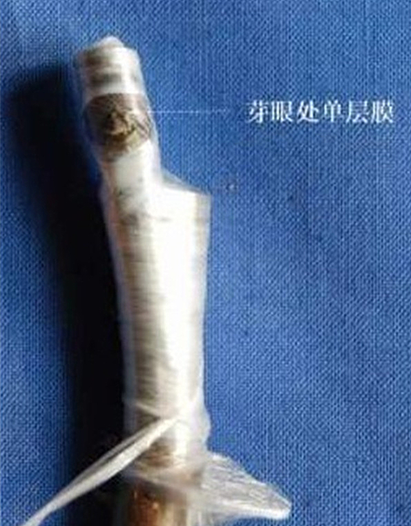 绑缚要严密,不透水,不透气。最好用0.006mm厚的农用地膜,在芽眼处只封一层,其他处可以多封几道。由于芽眼单层包扎,芽眼会自行突破薄膜,无需解除绑缚。