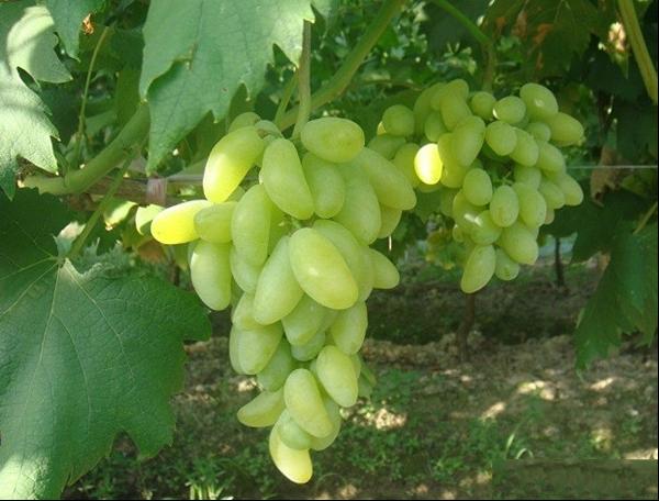2、金手指葡萄果实特点:金手指葡萄果穗中等大,长圆锥形,着粒松紧适度,平均穗重445克,最大980克,果粒长椭圆形至长形,略弯曲,呈菱角状,黄白色,平均粒重7.5克,最大可达10克。每果含种子0~3粒,多为1~2粒,有瘪子,无小青粒,果粉厚,极美观,果皮薄,可剥离,可以带皮吃。含可溶性固形物18~23%,最高达28.3%,有浓郁的冰糖味和牛奶味,品质极上,商品性极高。不易裂果,耐挤压,耐贮运性好,货架期长。