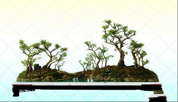 ①必须合乎自然:如果说在树木盆景中,可以有一些规则式或装饰性较强的造型,那么在水旱盆景中,树木材料必须完全以自然树木景象为依据,再做必要的取舍。在整枝技法上,一般适宜以修剪为主、蟠扎为辅。任何明显的人工痕迹,或是过度的变形,都会造成与其它部分的不协调,而影响到整体效果。