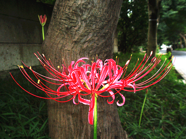 彼岸花即曼珠沙华(石蒜属植物)。曼珠沙华(“华”在古汉语中即是“花”之意),(英文:RedSpiderLily梵语:Mañjusaka);别名:两生花、龙爪花、老鸦蒜、曼殊沙华(stonegarlic)、蟑螂花、彼岸花、平地一声雷、老死不相往来、灶鸡花、死人花(shibitobana)、幽灵花(yuureibana)、地狱花(jigokubana)、天盖花(tengaibana)、剃刀花(kamisoribana)、舍子花(sutegobana)、鬼新娘花、蚯蚓花等。又名红花石蒜,是石蒜的一种,为血红色的彼岸花。多年生草本植物;地下有球形鳞茎,外包暗褐色膜质鳞被。叶带状较窄,色深绿,自基部抽生,发于夏末,落于秋初。花期夏末秋初,约从7月至9月。花茎长30-60厘米,通常4-6朵排成伞形,着生在花茎顶端,花瓣倒披针形,花被红色(亦有白花品种),向后开展卷曲,边缘呈皱波状,花被管极短;雄蕊和花柱突出,花型较小,周长在6厘米以上。