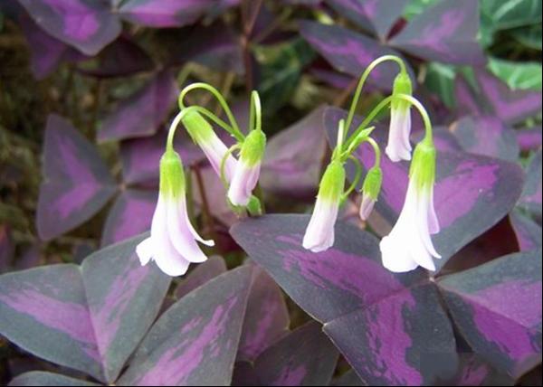 紫叶酢浆的草形态特征:多年生宿根草本植物,株高约15~30厘米,根肉质。叶簇生于地下鳞茎上,有长柄,为三出掌状复叶,小叶呈三角形,叶片初生时为玫瑰红色,成熟时紫红色。伞形花序,花白色至浅粉色。花期4~12月。