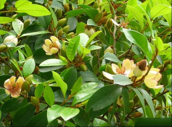 含笑形态特征:常绿灌木,高3~5米。树皮灰褐色,分枝很密,小枝有褐色绒毛。单叶互生,叶椭圆形至倒卵形,革质,叶面光滑。花单生于叶腋,直立状,乳黄色或乳白色,边缘常带紫晕色,花期4 ~6月。9月果熟。