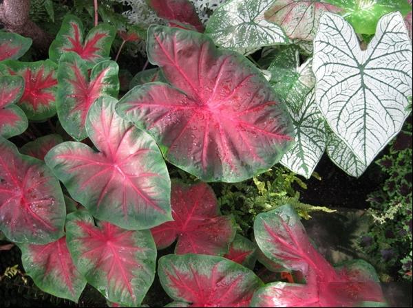 花叶芋园林用途:作室内盆栽,可配置案头、窗台。用白色塑料套盆或白瓷套盆则更显高雅。也可作为插花配叶,水养期约10天。在热带地区可室外栽培观赏,点缀花坛、花境。