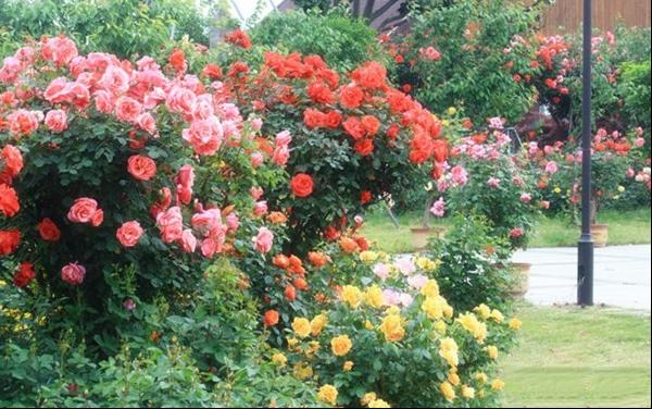 藤本月季花多色艳,全身开花、花头众多,甚为壮观。园林中多将之攀附于各式通风良好的架、廊之上,可形成花球、花柱、花墙、花海、拱门形、走廊形等景观。