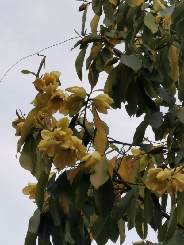 峨眉含笑花黄色,芳香,直径5-6厘米;花被片带肉质,9-12片,倒卵形或倒披针形,长4-5厘米,宽1-2.5厘米,内轮的较狭小;雄蕊长15-20毫米,花药长约12毫米,内向开裂,药隔伸出长约1毫米的短尖头,花丝绿色,长约2毫米;雌蕊群圆柱形,长3.5-4厘米;雌蕊长约6毫米,子房卵状椭圆体形,密被银灰色平伏细毛,花柱约与子房等长;胚珠约14枚。花梗具2-4苞片脱落痕。
