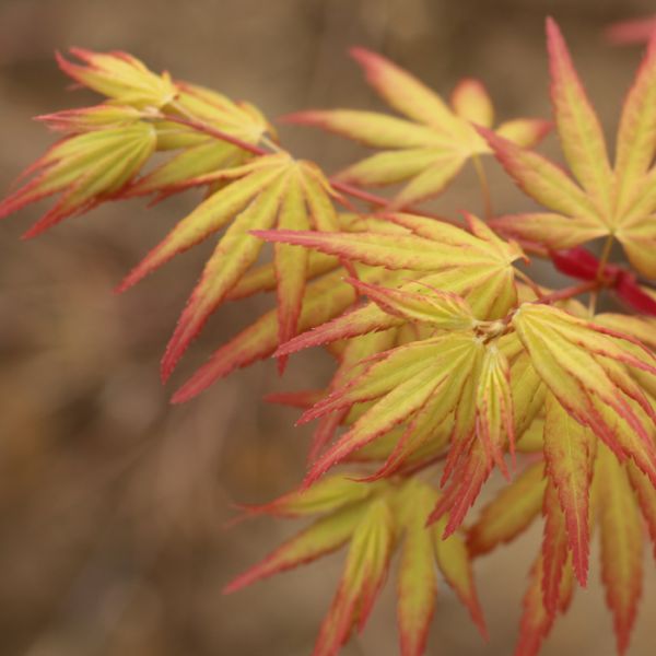 金桂黄枫,鸡爪槭属中优选出的变异品种,新芽红色,嫩叶亮黄色、叶缘橙红色,成熟叶叶缘变为黄色,生长旺盛期叶色为黄绿色,11月上旬叶色变为橙红色,观赏期长达160天左右。适应能力强,生长速度快,夏季无焦叶现象,此品种的优异表现,必为黄枫系中的佼佼者。