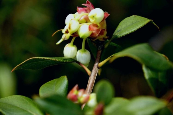 齿缘吊钟花是落叶灌木或小乔木,高2.6-6米。小枝光滑,无毛;芽鳞12-15}枚,宿存。叶密集枝顶,厚纸质,长圆形或长卵形,长6-8(-11)厘米,宽(2.8-)3.2-3.5(-4)厘米,先端短渐尖或渐尖,基部宽楔形或钝圆,边缘具细锯齿,不反卷,表面无毛,或中脉有微柔毛,背面中脉下部被白色柔毛,中脉、侧脉及网脉在两面明显,在背面隆起;叶柄较纤细,长6-12(-20)毫米,无毛。