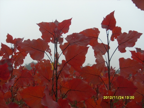 红叶杨当年扦插的小苗高度在60-70cm上下开始发侧枝,在整个生长季节,一般能发出5—7个侧枝,比中林46杨多4—5个,比69杨多3—4个。当年平茬的小苗,高度在35-40cm上下开始发侧枝,在整个生长季节,一般能发出8—14个侧枝,比中林46杨多5—9个,比69杨多2—6个。在正个生长期间,叶片鲜红,靓丽夺目。它的生长期是:在豫东地区,全红杨春季展叶期是3月28日至4月6日,比中林46杨早5—9天,比69杨早3—6天,比2025杨晚2—4天;它的封顶期是从9月15日—9月26日,落叶期为10月20日—11月15日,比中林46杨晚落叶60天左右,比69杨晚落叶20天左右,与红叶杨、2025杨相当。