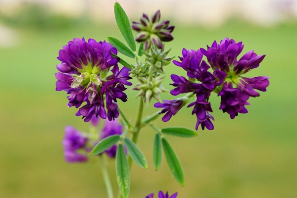 紫苜蓿是多年生草本,高30-100厘米。根粗壮,深入土层,根颈发达。茎直立、丛生以至平卧,四棱形,无毛或微被柔毛,枝叶茂盛。羽状三出复叶;托叶大,卵状披针形,先端锐尖,基部全缘或具1-2齿裂,脉纹清晰;叶柄比小叶短;小叶长卵形、倒长卵形至线状卵形,等大,或顶生小叶稍大,长(5)10-25(-40)毫米,宽3-10毫米,纸质,先端钝圆,具由中脉伸出的长齿尖,基部狭窄,楔形,边缘三分之一以上具锯齿,上面无毛,深绿色,下面被贴伏柔毛,侧脉8-10对,与中脉成锐角,在近叶边处略有分叉;顶生小叶柄比侧生小叶柄略长。