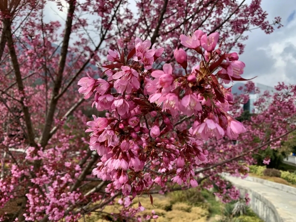 高盆高盆樱桃(学名:Cerasuscerasoides(D.Don)Sok.):乔木,高3-10米;枝幼时绿色,被短柔毛,不久脱落;老枝灰黑色,叶片卵状披针形或长圆披针形,叶边有细锐重锯齿或单锯齿,上面深绿色,下面淡绿、无毛,网脉细密,近革质。花1-3,伞形排列,与叶同时开放;苞片近圆形,边有腺齿,革质;花瓣卵圆形,先端圆钝或微凹,淡粉色至白色。核果圆卵形,熟时紫黑色;核圆卵形,顶端圆钝,边有深沟和孔穴。花期10月至12月。2n=16。