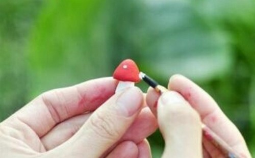 6、在捏好且成蘑菇状的成品上涂上相应的颜色,让其看起来更像是野外长出来的蘑菇一样,让其显得更加生动、逼真,同时可以按照此法多做几个大小不一的。