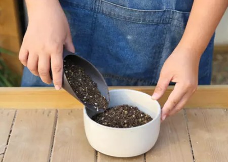 2、将前面提到的各种调料、主料彻底混合,然后用鸭舌铲填入花器中,用手轻压土壤,保持土壤距离花器顶部还有1CM的距离。