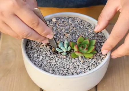 3、然后加入之前准备好的铺面石(麦饭石),同样用手将石子铺平,保持距离花器顶部0.5CM的距离。(如果一次填得太满,在后期栽种时土壤会和石子混在一起,变得很难看,也不利于栽种肉肉)这一步是为了更方便干净,如果先将多肉植物栽种好后再铺石子,会弄得非常乱。