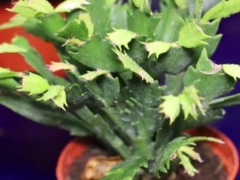 茎叶是蟹爪兰的重要组织,通常长得比较肥厚,而且挺拔有力,看起来充满活力、精神十足。正常情况下,蟹爪兰的茎叶是呈油绿状态的,如果出现发红,甚至是发干的情况,必然生长上出现了问题。
