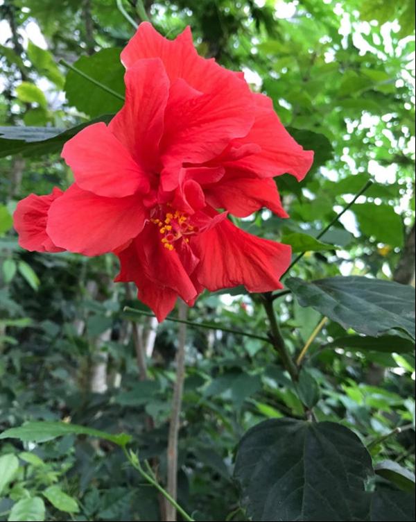 重瓣朱槿 锦葵科木槿属 重瓣朱槿是常绿灌木,高约1-3米;小枝圆柱形,疏被星状柔毛。叶阔卵形或狭卵形,长4-9厘米,宽2-5厘米,先端渐尖,基部圆形或楔形,边缘具粗齿或缺刻,两面除背面沿脉上有少许疏毛外均无毛;叶柄长5-20毫米,上面被长柔毛;托叶线形,长5-12毫米,被毛。